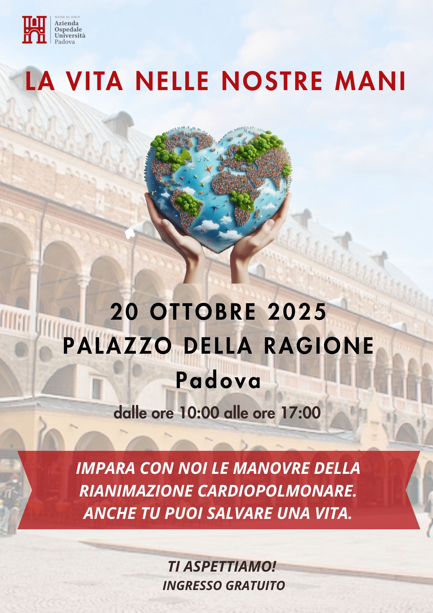 Anche l'Azienda aderisce alla manifestazione e promuove una giornata aperta a tutta la cittadinanza per imparare le manovre salvavita. Appuntamento il 20 ottobre dalle 10 alle 17 al Palazzo della Ragione con i professionisti della UOC Pronto Soccorso, diretto dal dott. Vito Cianci, della UOSD Pronto Soccorso Sant'Antonio, diretto dalla dott.ssa Alessandra Pizziol, del SUEM 118, diretto dal dott. Andrea Paoli. Fondamentale è migliorare la conoscenza e la formazione dei cittadini in merito alla rianimazione cardiopolmonare. Lo slogan scelto per l'edizione 2025 è: 'la vita è nelle nostre mani'.