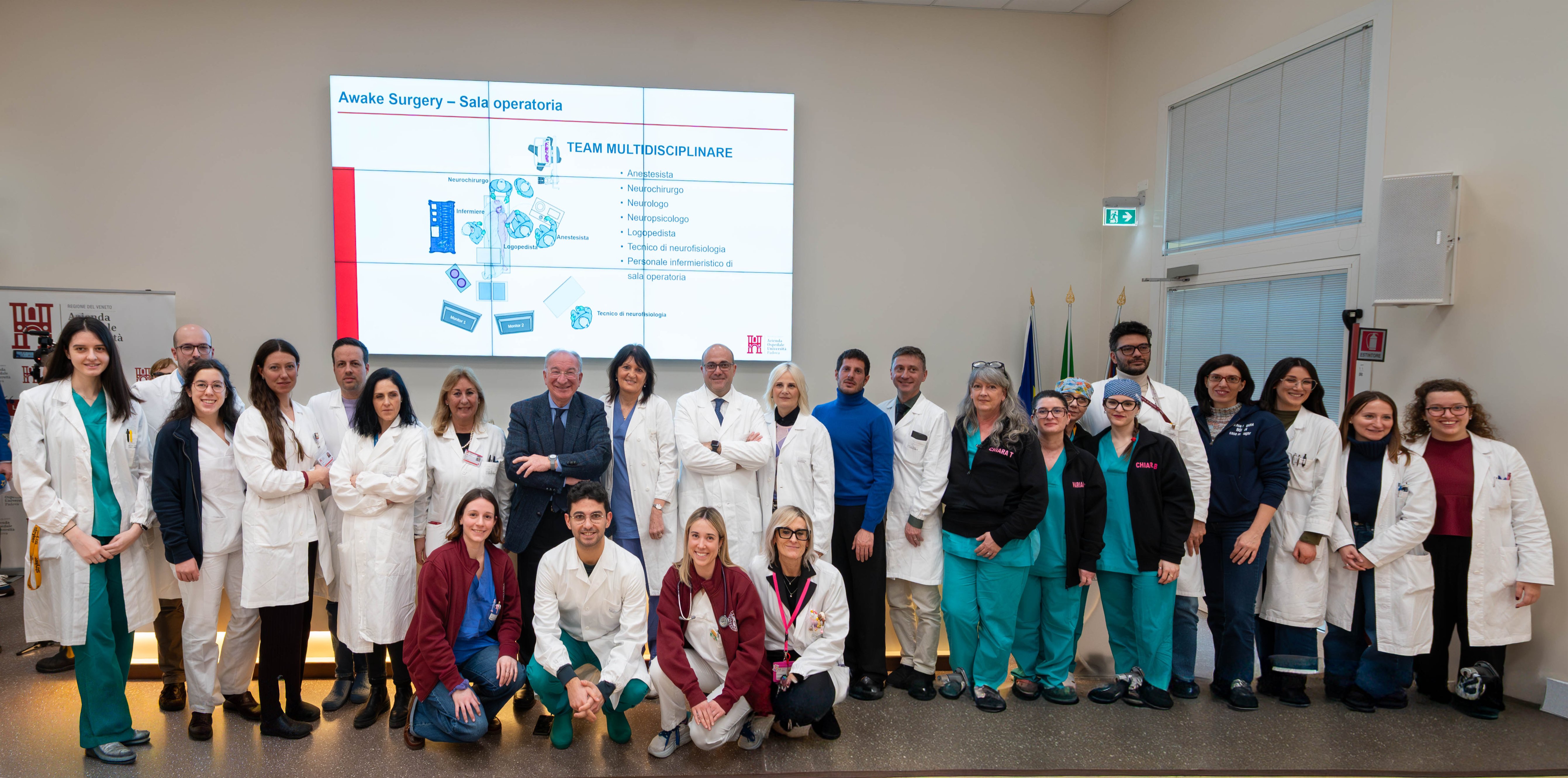 Il team multidisciplinare coordinato dal prof. Luca Denaro era composto da anestesisti, neurologi, neurochirurghi, neuropsicologi, logopedisti, tecnici di neurofisiologia, personale infermieristico di sala operatoria.