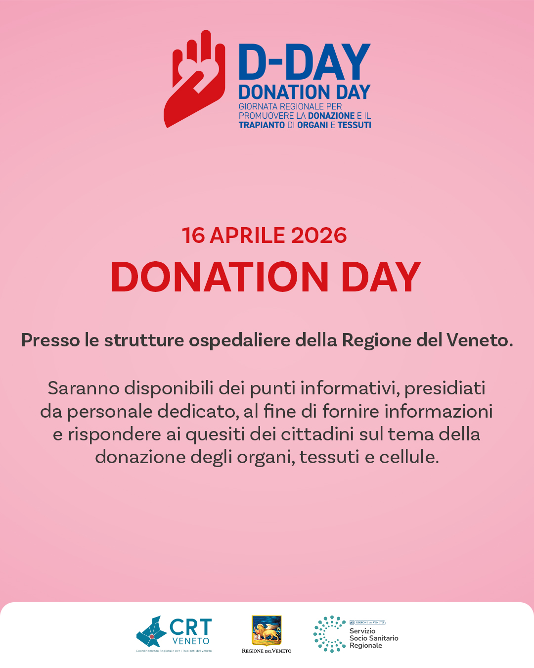 Giovedì 16 aprile sarà il 'Donation Day' in tutti gli ospedali veneti. Anche in Azienda. Appuntamento per l'intera giornata nel Chiostro del Giustinianeo con il coordinamento del dott. Demetrio Pittarello, direttore CRT.