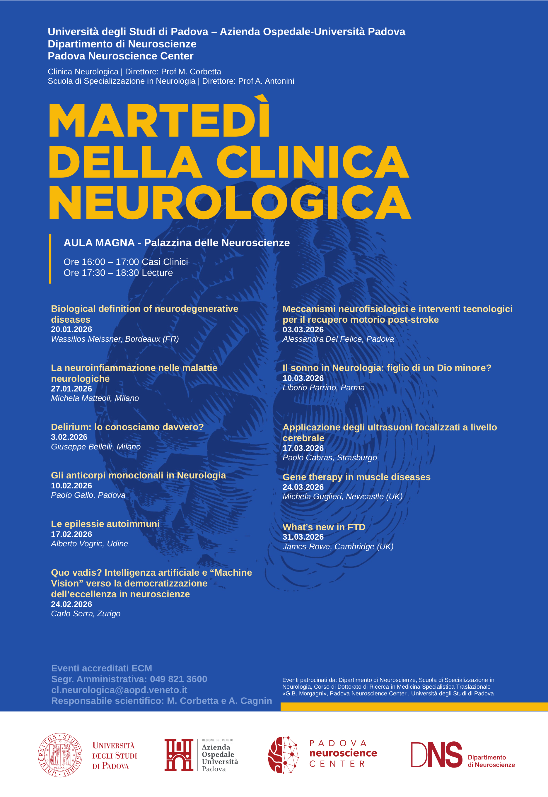 Il programma del 2026 si svolgerà, come sempre, ogni martedì a partire dal 20 Gennaio in Aula Magna della Palazzina di Neuroscienze, Azienda-Ospedale-Università di Padova, in modalità duale in presenza e in streaming, dalle ore 17.30 alle 18.30. Prima del seminario, alle ore 16.00, si terrà una discussione con il relatore su casi clinici real world attinenti all’argomento del giorno.